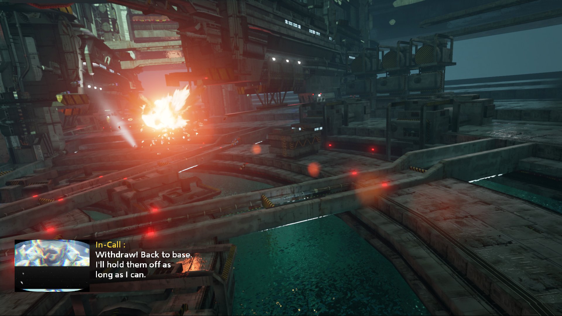 The core mechanic of Strike Vector EX is that you have two modes: a hover-idle mode that lets you float around, make pointed turns, and move slowly; and what amounts to an afterburner mode where you are flying full speed like a jet fighter. And woe be anything that tries to catch you. Until you run into a pipe or something on the oil-rig-like thing you are fighting around. Then you blow up. All in all, this is really exhilarating to play and makes you feel like some kind of aerospace mech god; it was like playing the Gundam game that I always wanted, minus the giant mech-sized laser swords. I liked it best when I switched from third- to first-person mode, where I actually felt I had a better sense of direction.