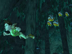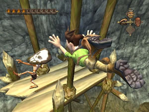 Most of the gameplay is your standard platformer fare: jump around on moving things, collect stuff, and kill enemies using a couple different moves. The main objective at any given point in Pitfall: