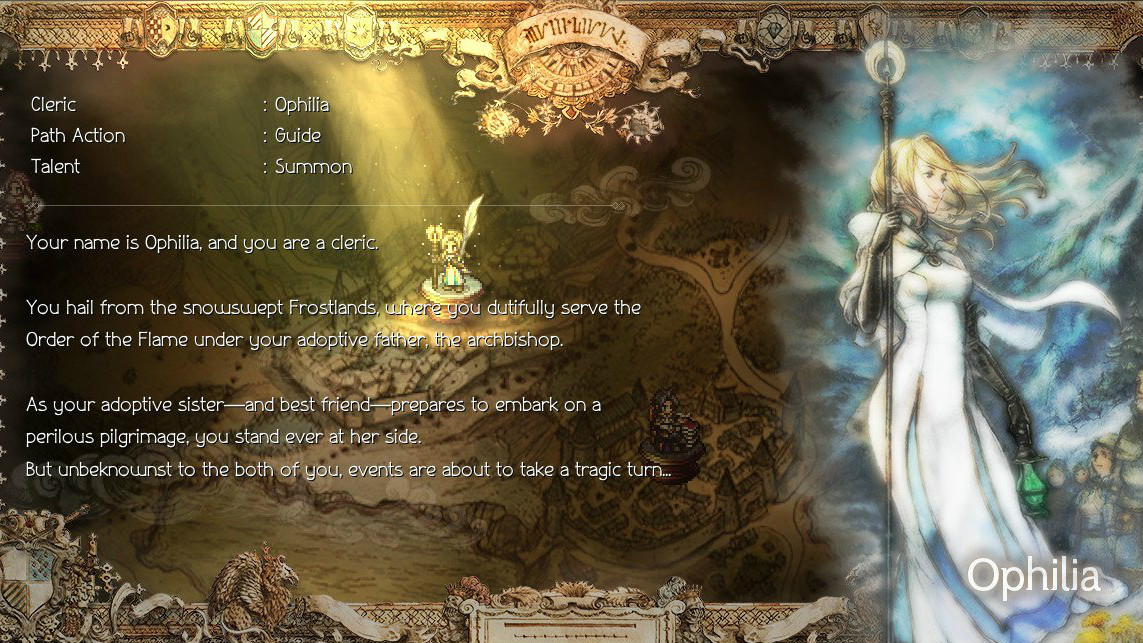 Octopath Traveler is, as the title suggests, about eight individuals who, for one reason or another, end up traveling the country of Orsterra. You can start with any of the eight you want, and upon completing the first chapter of their story, move on the next chapter, or take a break to seek out another of the eight and start their narrative.