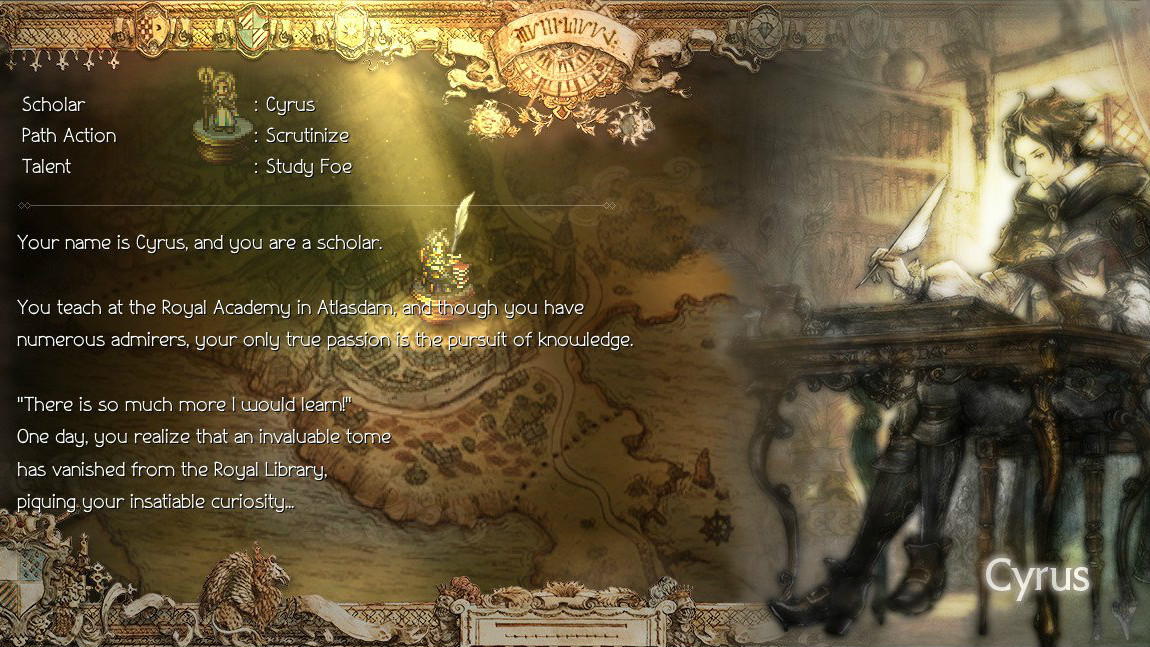 One of the most inventive elements in Octopath Traveler is that each character has a unique path action that allows them to interact with the citizens of Orsterra. For example, Cyrus the scholar can scrutinize the NPCs you meet which gives you a blurb of background story about them and can lead to hidden items or new quests. Tressa, the merchant, can purchase items from NPCs that would otherwise be inaccessible.