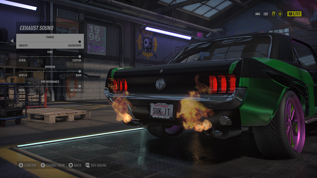 While there are a few interesting additions to the open world (hello, flamingo collectibles!), not a lot has changed outside of races. There are speed traps to blast through, billboards to crash into, and other similar challenges. One neat addition is collecting street art and then using it to customize your vehicle’s wrap. All the customization lives up to the high standards of car games, with plenty of options for Heat‘s wide range of vehicles. It takes quite a bit of time to grind the two currencies required to get any car you want, but at least you can make a gaudy mess once you’re done. Also, I really appreciate the hilarity of rocking a Payback vanity plate I received as a reward for my past suffering.