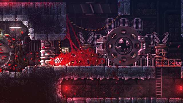 Unlike most Metroidvania games, Carrion doesn’t let you access a map. There is some degree of back-and-forth between areas, but I rarely struggled with navigating my way around, and each area typically contains a brief lever and door puzzle or a handful of enemies. Enemy types are limited, with the majority being men with guns and shields. There’s a bunch of cannon fodder to chew on, too, who won’t put up much of a fight but will make you feel like a big scary blob.