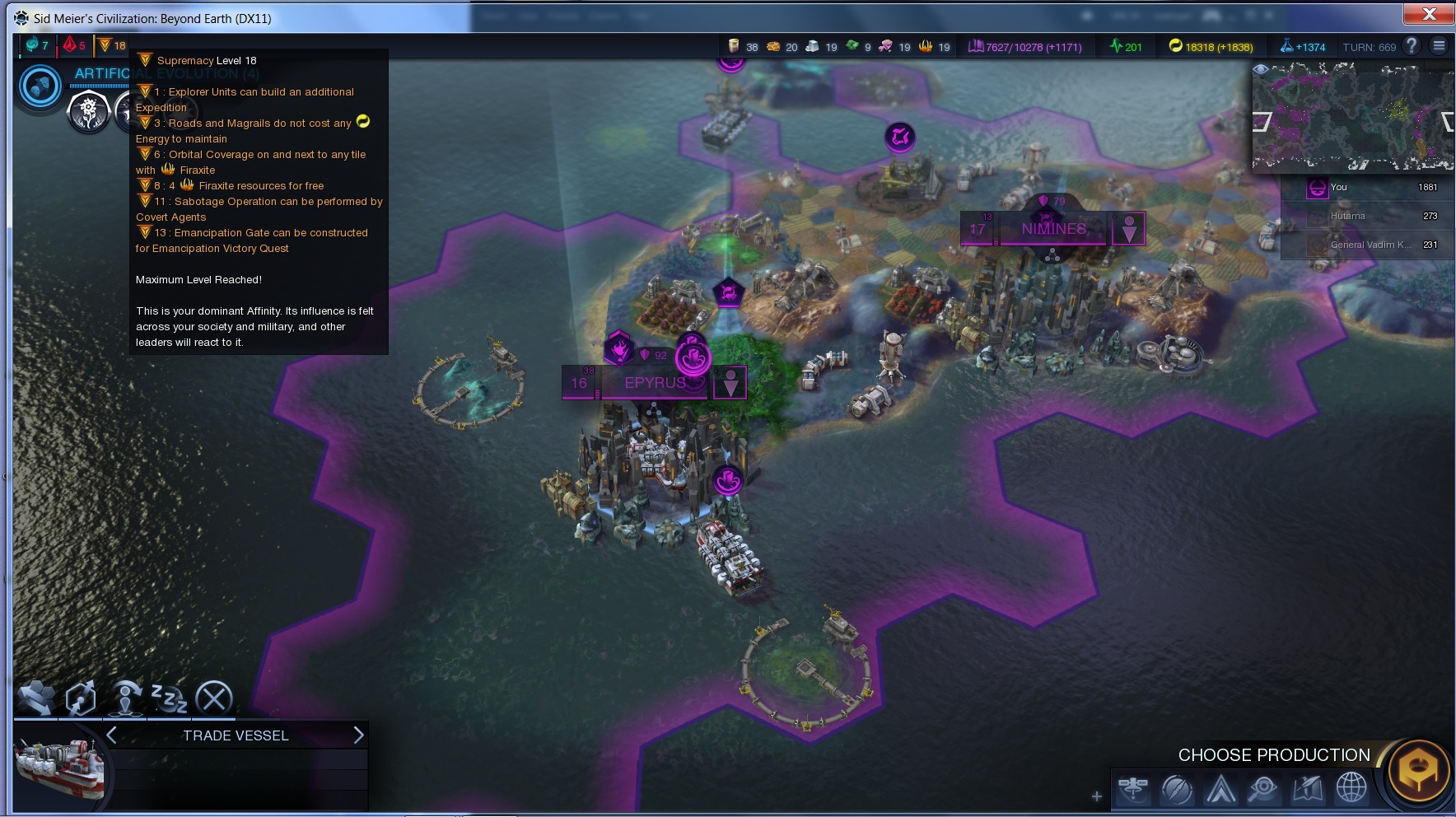 Three of the five victory conditions in Beyond Earth focus on building a Planetary Wonder based on the three new affinities—Supremacy, Purity, and Harmony—which have more impact than the three Ideologies of Freedom, Autocracy, and Order in Brave New World that they're derived from. These affinities effectively represent varying reactions to the quintessential "man vs. nature" conflict… if we modify nature to include aliens. The Harmony path seeks to become one with the aliens on the planet, whereas the Supremacy path wishes to evolve the human race in order to dominate the aliens, and the Purity path rejects alien life altogether in the belief that humans should stay as they are. That said, there's no reason you can't play an aggressive Harmony build or a peaceful Supremacy build to throw off your opponents.