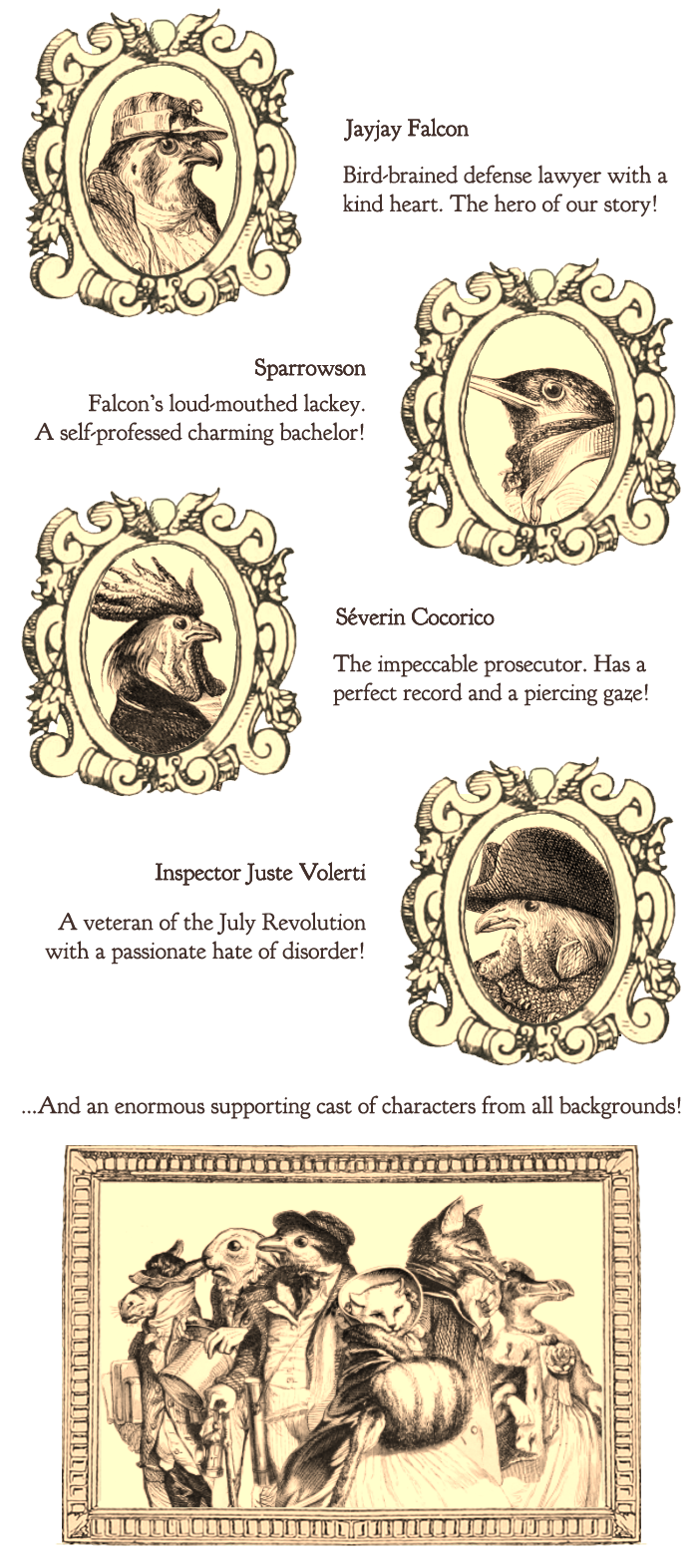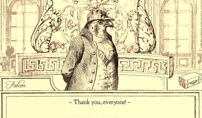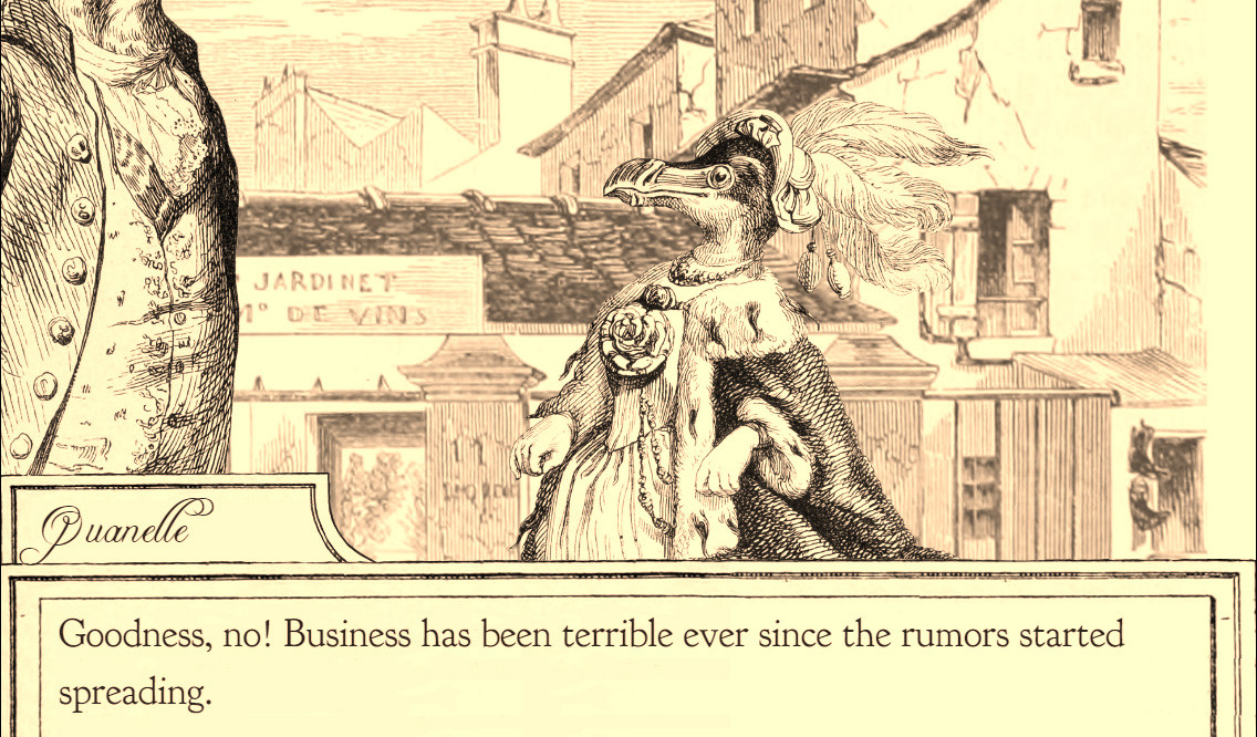 Smarmy introduction aside, Aviary Attorney was briefly in the realm of crowd-funded vaporware, wrapping up a successful Kickstarter campaign in January 2015, with updates coming out on a meager basis until surprising people with the December launch. Billed as “potentially the hottest bird lawyering game to come out of 1840's France,” the game puts players in control of Monsieur Jayjay Falcon, the finest bird lawyer this side of the top of the yellow pages. Together with his wisecracking assistant with a penchant for pickpocketing, Sparrowson, the two birds work to defend some of 1848 France's most reputable people, including the wealthy feline Dame Caterline, Juan Querido, the supposed fox prince of Spain, and others, eventually finding themselves wrapped up in the makings of a proletariat rebellion and fighting for their own lives. Talk about ruffling feathers.