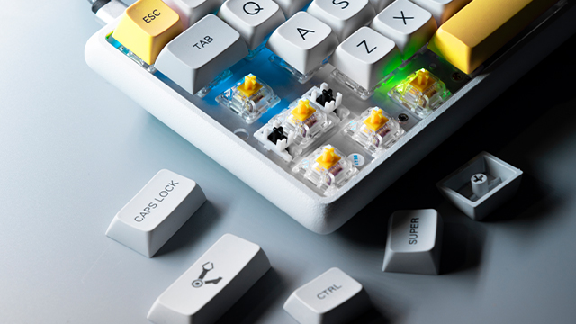 The first big hurdle for prebuilt boards is the stabilizers. A loud rattle from the stabilizers can be an immediate death sentence for keyboards, especially the pesky space bar. With the Epomaker Lite, lubed stabilizers have been combined with a heavier “Rose Brown” keyswitch to reduce any element of rattle. The other keys use a lighter red switch, so the overall typing experience is still light and non-fatiguing. Using different switches for the modifiers is pretty genius, really.