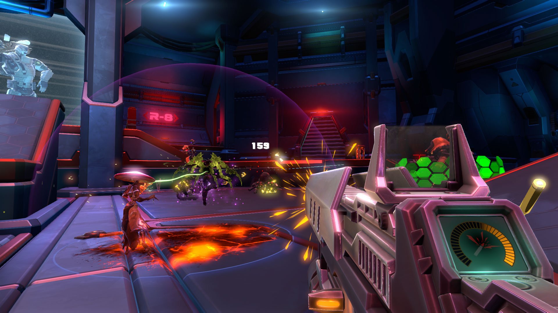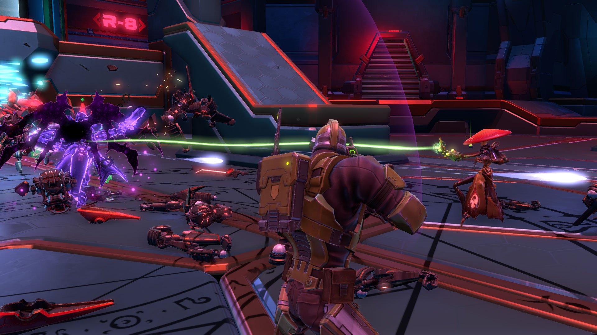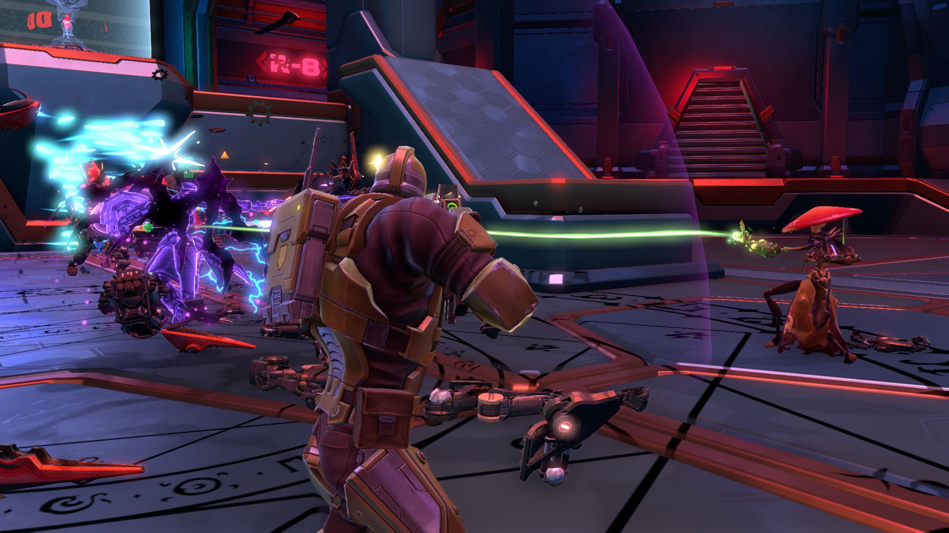 To be more specific, Battleborn is a cross between a MOBA (so it's more a MOBA-like) and Borderlands, whose fingerprints all over Battleborn like an invigorating deep-tissue massage. They're both co-operative first-person action games that take place in space with spurts of humorous dialogue throughout. Hurting enemies sends out damage numbers above their heads, each character has a shield with recovery delay, running over currency (in this case, shards) automatically picks them up—the similarities are numerous. In fact, I wouldn't be surprised if the universes of Borderlands and Battleborn cross over at some point. Regardless, if you have any experience playing Borderlands, then you'll feel comfortable in the pocket of Battleborn's groove.