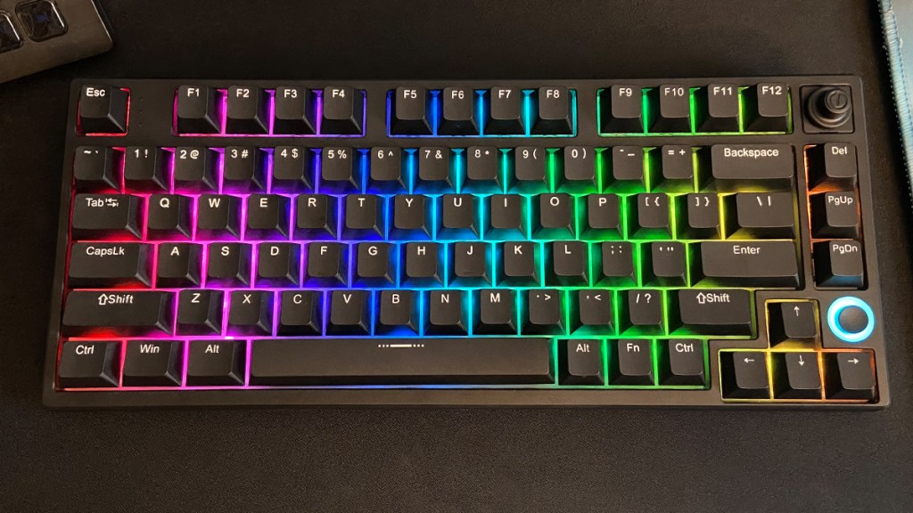 Then there’s the RGB D-pad joystick which, by default, controls the various lighting effects, but can be customized to do almost anything the user wants. The keycaps also draw the eye with their two-tone color schemes, of which there are four variants. They use PBT plastic and have the rough texture that leads to enhanced durability.