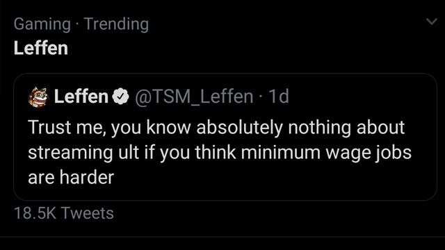 Leffen began trending on Twitter due to his claim, with many pointing out the difference between the struggles faced by minimum wage workers as opposed to those who make a full-time living from streaming. Leffen later deleted the tweet, saying it had been taken “out of context” but that it was still “a really sh*tty tweet.”